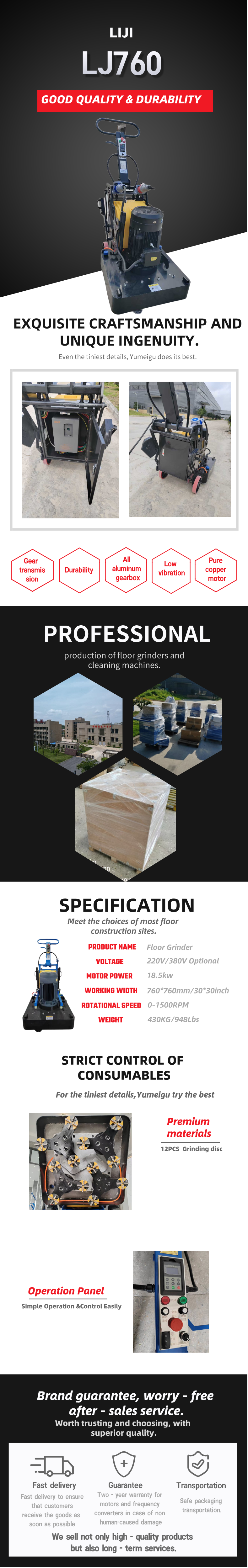 LJ640V Concrete Floor Grinder、Commercial Concrete Polisher、High-power Grinding Equipment